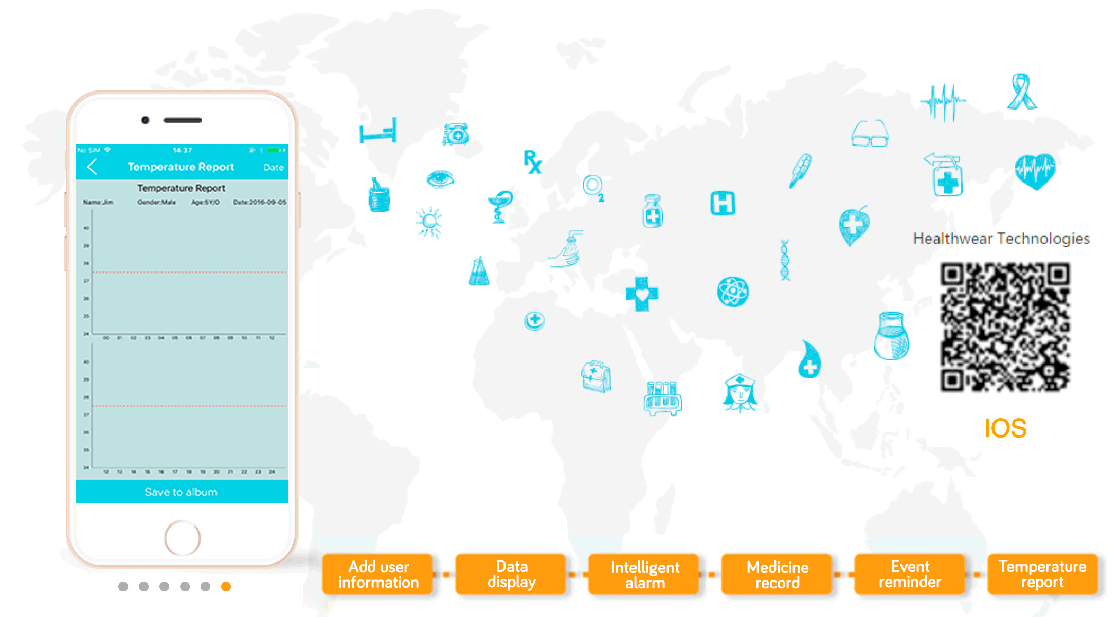 1. Download and install the TempSense App from Apple AppStore for iPhone or go to www.healthwear-tech.com, scan QR code to download and install.